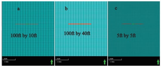Figure 1 displays the fine grid reservoir model and a vertical well with a hydraulic fracture. Using the same property, two other coarse grid reservoir models, namely coarse grid model 1 and coarse grid model 2, with an aerial dimension of 100 × 10 ft and 100 × 40 ft, respectively, are constructed as shown in Figure 2. The respective data are also presented in Table 1, along with the reference sector model. In order to minimize the simulation run time, only a sector model of the reference synthetic model is used. This is possible by first identifying the drainage area without a boundary effect. A dual-porosity model is used for the fractured area only. In the simulation model, the sigma factor controls the flow between the matrix and the fracture. In the fine grid, the single porosity can be applied to draw a fracture directly; however, in a coarse grid, it is better to use dual porosity in the fracture.