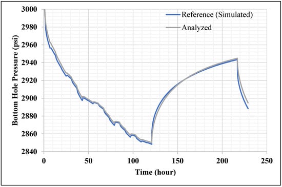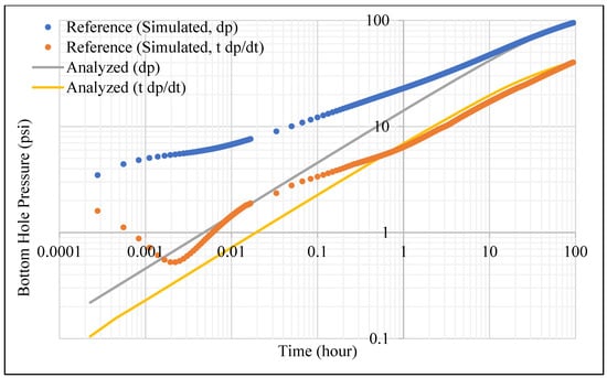 Figure 3 displays the simulated result of a pressure build-up test of the reference model. As presented in the previous section, this case is selected as a reference to represent a real reservoir. Well tests in exploration wells and new wells are often made in a sequence where a drawdown test precedes a build-up test. The build-up test is analytically interpreted by using well-established pressure transient analysis techniques found in many textbooks and the literature. The interpretation can be drawn using methods such as Horner analysis and Miller–Dyes–Hutchinson (MDH) analysis []. The detailed description of the equations for pressure transient analysis can be referred to from any well test analysis textbooks. The Horner analysis assumes infinite acting flow at shut-in, which is a short production period. The MDH analysis is based on the opposite assumption that the stable production period before shut-in is very long, and thus pressure changes that originate from the production can be ignored compared to the pressure changes due to a shut-in. The log–log plot analysis is also presented in Figure 4.