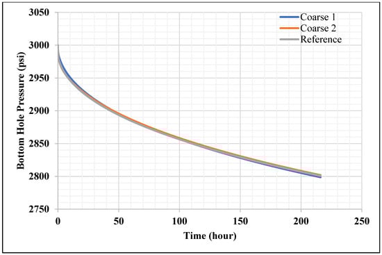 Bottom hole pressure of the Base Case, Coarse Case, and Reference for a constant flow rate.
