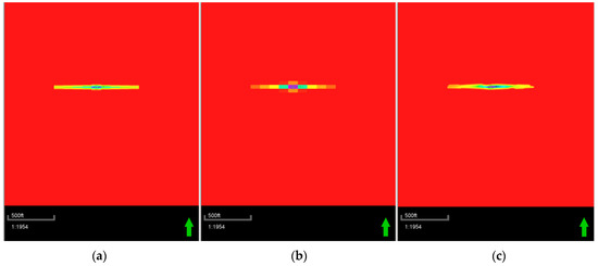 Coarse and coarser gridding for production performance comparison, (a) Coarse model 1 (b) Coarse model 2, (c) Reference sector model.