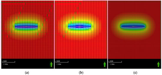 In Figure 6, the early time (9 h) pressure behavior in the reservoir is a little bit different because of the shape of the fracture, even though the bottomhole pressure behavior is very similar, as shown in Figure 5. However, the pressure behavior in the reservoir is very similar at a later time (240 h), as shown in Figure 7 and Figure 8. Those cases will go to a radial flow if there is no boundary effect.