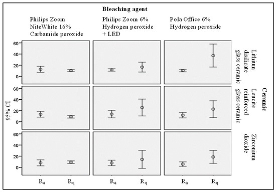 The opposite results were observed in investigation performed by Bahannan et al. [23], where it was shown that bleaching feldspathic porcelain with 10%, 20%, and 35% carbamide peroxide, the strongest effect on surface roughness was achieved with 20% and 35% bleaching agents. The study conducted by Demir et al. [7] revealed that bleaching of glazed lithium disilicate and leucite-reinforced glass-ceramics samples with 16% carbamide peroxide for 6 h per day for seven days increased surface roughness of both types of ceramics.