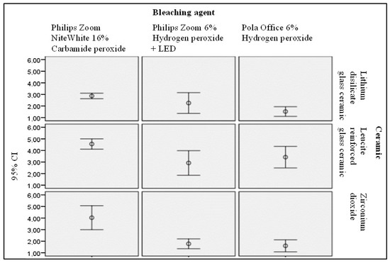 The results of the performed statistical analysis of colour changes of samples due to the bleaching are provided in Figure 3.