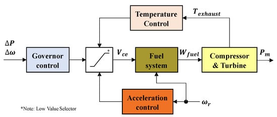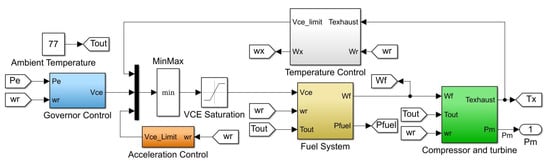 The model implemented in Simulink consists of a compressor and turbine, fuel system, acceleration, temperature, and governor control. Figure 3 shows a general diagram of the CHP model.