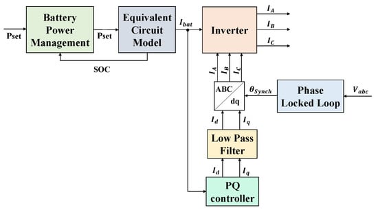 The model selected was an equivalent electric circuit because it has better accuracy, and it is not as complex as the mathematical model. Considering the information obtained from the literature and from the forecast for 2030 stated in IRENA about the lithium-ion batteries as leadership of the technology. This model is composed by a voltage source with a series resistor, representing the battery’s open circuit voltage (OCV) and internal resistance, respectively. Moreover, two RC networks in series were used to represent the electrochemical and concentration polarization of the battery. The voltage source was modeled using a lookup table that describes the relationship between the OCV and the battery level, which can be used to calculate the dynamic values of the battery’s internal resistances and the two RC networks. In the same way as in PV model, the inverter was modeled as a continuous ideal AC current source. Finally, a phase-locked loop (PLL) was used to perform the synchronization with the grid. This model was constructed in Simulink, as the other models. The representation model is shown in Figure 4.