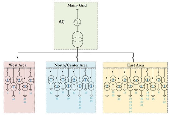 In addition, a model of the electrical system was built in MATLAB-Simulink to verify the behavior of the system in steady state. On the other hand, the UPRM electric system is composed of twenty-four electric cabinets and sixty-one secondary electric substations. The system is divided in three areas: West, North/Center, and East, with twelve, fourteen, and thirty-five electric substations, respectively. The simplified one-line diagram of UPRM is shown in Figure 6. The numbers after the arrows correspond to the identification of the buildings visible on the UPRM map sketch.