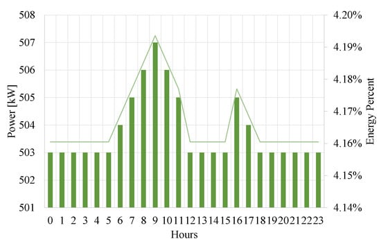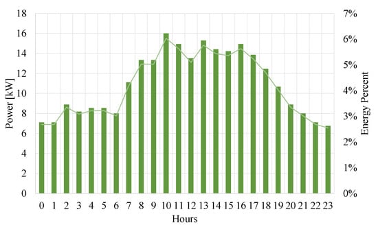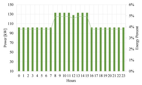 The Medical Service load uses an approximate daily consumption according to the meter; however, the profile was adjusted like a typical curve of a hospital. The curve used is presented in Figure 7.