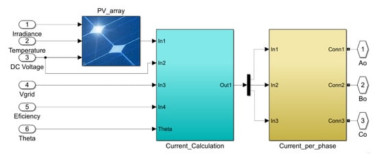 Figure 10 shows the model constructed in MATLAB-Simulink. The PV array block contains the mathematical equation described in Section 3 and Section 3.4.1. This equation considered variables such as irradiance, temperature, and DC voltage as input. The output is a current that is an input to the current calculation block. The current calculation block has as input variables, the grid voltage, the efficiency and synchronization angle with the main grid, and the energy of the PV to calculate the current injected into the grid. The current injected into the grid is received for the current per phase block that generates the voltage so that a current can flow through each phase.