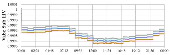 The voltage profile in the substation in the low voltage side is shown in Figure 17 indicating that the MG installation does not affect the correct functioning of the system, thus the voltage profile is improved. This occurs because initially all the load of the university was being supplied, however, when the disconnection of the main grid occurred, only the critical loads were supplied. In the same figure it could be observed that the voltage in p.u presented some violations. That occurs due to abrupt changes in the solar radiation such as what happened during day number two.