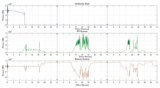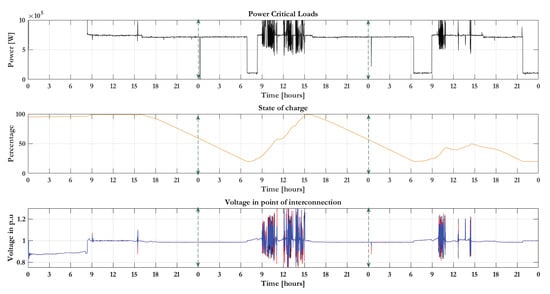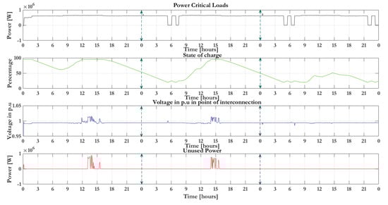 When a MG operates in islanding mode, it is necessary to know the days of austerity that it could provide. The days of austerity are defined as the days that the MG could be operated in islanding without load interruptions. In this scenario two austerity days were considered, as could be observed in Figure 17, when the load is disconnected for around 86 min or 1.4 h. This disconnection occurs due to the state of charge of the battery being 20%, and it could not supply the energy required for the load. The load is reconnected when the battery reaches a state of charge equivalent to 25%.