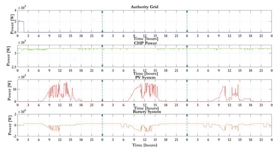 After the simulation, the behavior of the system was analyzed. It can be observed that initially, the main grid is connected, but between one and two in the morning, the main grid is disconnected. That is when the needed energy for the critical load is supplied by the MG. For the simulation 30 days were evaluated, however, the results are shown only for the three first days for a better visualization. In Figure 18 the power from the grid is observed, as well as the power by CHP, the power by PV system, and the power supplied by battery system. In the same way, Figure 19 shows the power in critical loads, the state of charge in the battery, the voltage per unit at interconnection point, and the unused power.