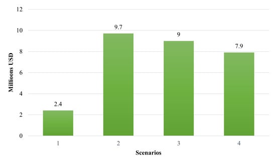 Considering the use of propane gas, a comparison is made between the scenarios with the initial cost and a projection of the fuel cost for scenarios number 2 and 4 in 10 years. This information is summarized in Table 12 and Figure 20. From the comparison, despite scenario number 3 having a lower initial cost, when carrying out the fuel cost projection, the most profitable in 10 years is scenario number 4.