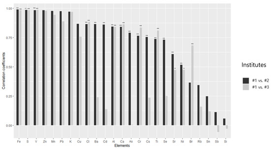 Spearman’s correlation coefficients for the metals between institute #1 and institute #2, and those between institute #1 and institute #3 are shown in Figure 2. Between institute #1 and institute #2, Fe, S, V, Zn, Mn, Pb, and K showed high correlation coefficients (0.90 or higher; p < 0.01) while Cu, Cl, Ba, Cd, Al, and Ca showed correlation coefficients between 0.80 and 0.89 (p < 0.01). Among the other elements, the correlation coefficients were 0.789 for As, 0.765 for Cr, 0.753 for Cs, 0.737 for Ti, 0.730 for Se, and 0.607 for Sr.