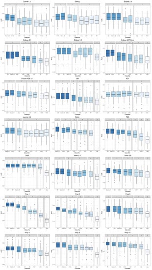 - Aljamaan, H.; Alazba, A. Software defect prediction using tree-based ensembles. In Proceedings of the 16th ACM International Conference on Predictive Models and Data Analytics in Software Engineering, Virtual Event, 8–9 November 2020; Association for Computing Machinery: New York, NY, USA, 2020; pp. 1–10. [Google Scholar]