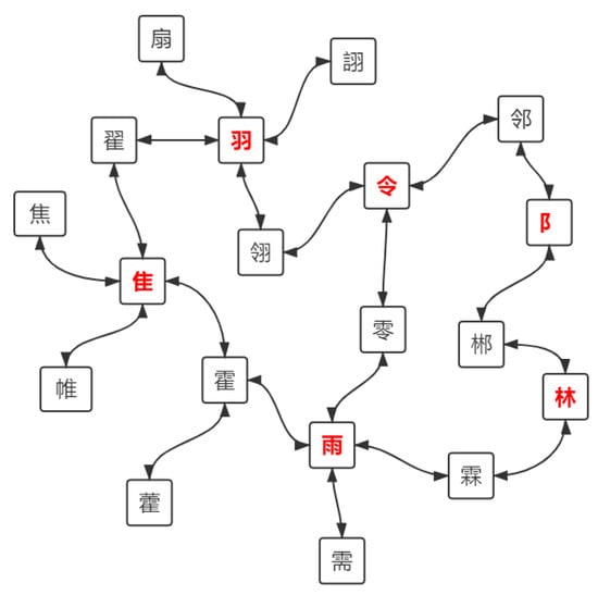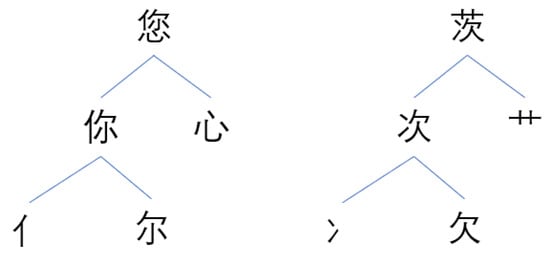 The structure information of characters are labeled by the Kanji Database Project (http://kanji-database.sourceforge.net/, accessed on 12 September 2021). The shape information of Chinese characters is represented by unicode standard—Ideographic Description Sequence (IDS). For example, character “您” is represented as “U+60A8 您你心”, while character “你” is represented as “U+4F60 你亻尔”. As illustrated in Figure 3, we build the glyph graph according to IDS labels of Chinese characters by connecting characters and their sub-components. Table 2 shows some statistics of the glyph graph.