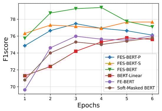 In this section, we analyze the effect of shape embeddings and pronunciation embeddings on SIGHAN15. We trained FES-BERT with only pronunciation embeddings or shape embeddings as an external feature. The experimental results on SIGHAN15 can be seen in Table 6. Figure 5 shows the test curves of FES-BERT-S, FES-BERT-P, FES-BERT, BERT-Linear, FE-BERT, and Soft-Masked BERT.