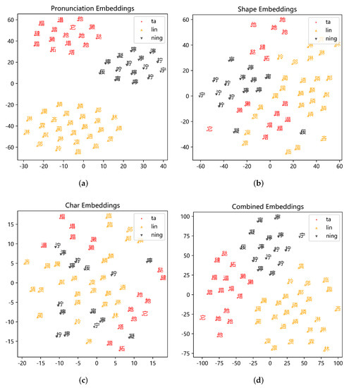 Figure 6 shows visualization results of embedddings by t-SNE []. Characters with Pinyin “lin”, “ning”, or “ta” are presented in the figure.
