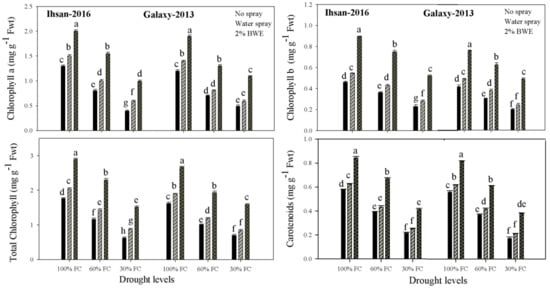 The chlorophyll a, chlorophyll b, total chlorophyll and carotenoid contents of both wheat cultivars decreased with increasing drought levels (Figure 1; Table 1). The interactive effect of drought and BWE for all photosynthetic traits were non-significant (p ≤ 0.05) for both wheat cultivars (Table 1). Compared to 100% FC, the chlorophyll a and b, total chlorophyll and carotenoid contents decreased by 59 and 30%, 46 and 19%, 55 and 27%, and 57 and 27% at 30% and 60% FC, respectively, in Ihsan-2016 (Figure 1; Table 1). In Galaxy-2013, the chlorophyll a content decreased by 51 and 37%, chlorophyll b by 44 and 21%, total chlorophyll by 49 and 33% and carotenoid by 61 and 30% at 30% and 60% FC, respectively, as compared to 100% FC. Averaging both cultivars, the application of 2% BWE enhanced the chlorophyll a content by 54, 90 and 139%; chlorophyll b by 90, 108 and 141%; total chlorophyll by 41, 58 and 82%; and carotenoid by 47, 69 and 112% at 100, 60 and 30% FC, respectively, as compared with the control (no BWE application) (Figure 1; Table 1). The results reveal that BWE was more effective in enhancing chlorophyll a and b and the total chlorophyll contents under severe drought (30% FC) as compared with mild-drought (60% FC) and well-watered conditions (100% FC). The foliar spray of 2.0% BWE enhanced the chlorophyll content a by 55 and 59%, chlorophyll b by 94 and 86%, total chlorophyll by 64 and 65%, and carotenoid by 48 and 47% at 100% FC in Ihsan-2016 and Galaxy-2013, respectively (Figure 1).