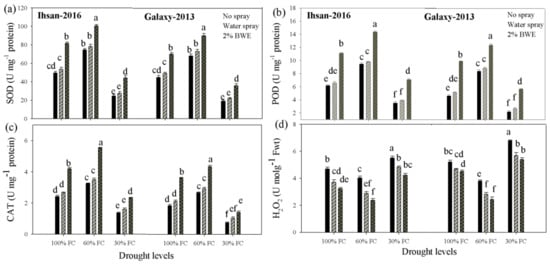 Nonetheless, the foliar application of BWE enhanced the activities of antioxidant enzymes under well-watered (100% FC) and drought stress conditions. Averaging both cultivars, the application of 2% BWE enhanced the activity of SOD by 61, 33 and 84%, POD by 96, 49 and 130% and CAT by 85, 67 and 81% at 100, 60 and 30% FC, respectively, as compared with the control treatment without BWE (Figure 2).