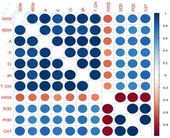 Correlation between the morpho-physiological and biochemical traits of the wheat cultivars under different drought levels. SDW: shoot dry weight; RDW: root dry weight; A: photosynthesis rate; E: transpiration rate; Ci: internal carbon dioxide concentration; gs: stomatal conductance; T. Chl.: total chlorophyll; H2O2: hydrogen peroxide; SOD: superoxide dismutase; POD: peroxidase; CAT: catalase.