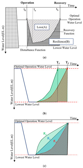 Resilience of Hydroelectric Dam. (a) Concept of Resilience; (b) Resilience with recovery time; (c) Resilience with recovery function.
