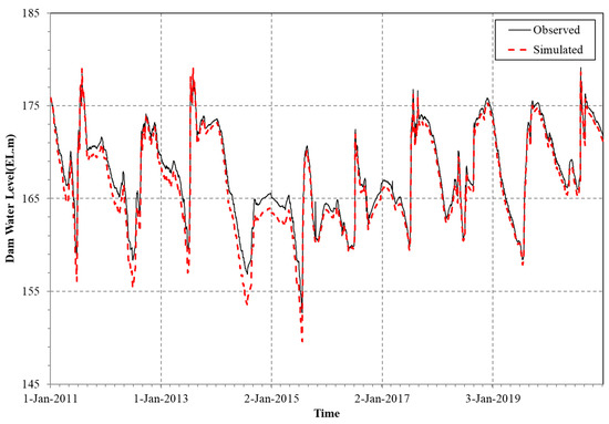 It was checked to see how effective the optimal operation results were compared to the past performance. The period for comparison is 2006–2013. Table 4 shows the results of comparing the power generation of all dams, which are operational goals, with the past performance. Hwacheon Dam and Chuncheon Dam, which were evaluated for their low resilience, produced less electricity than their past performance. However, the Uiam Dam and Cheongpyeong Dam, located downstream, produced more electricity than the historical data because a large amount of discharge was performed at a high dam water level. At this time, it was confirmed that the value of resilience was also highly evaluated. In the case of Cheongpyeong Dam, which is located the most downstream, about 50% more electricity could be produced. If the four dams were evaluated as a single power system, the power generation could be increased by 151,652 MWh. This is a result of an increase of about 19.83%. The operation of the hydropower reservoir considering resilience resulted in improved power production, which is the main performance. However, in this study, it cannot be said that all possible operating rules are reflected because it is simply a scenario in which the target water level and outflow discharge are increased and decreased at a certain rate. Therefore, if research on random scenarios is added in the future, it is expected that the optimal operating rules for maximizing electricity sales will be obtained.