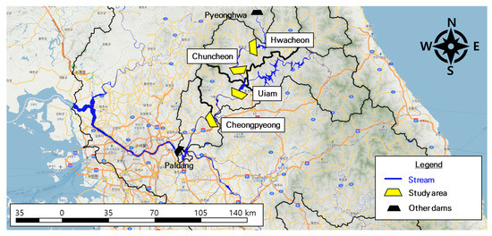 The simulation was applied to Hwacheon Dam, Chuncheon Dam, Uiam Dam, and Cheongpyeong Dam, which are hydropower reservoirs located in the Bukhangang watershed in South Korea. The dams are all connected in series, and the outflow discharge of the upstream dam affects the inflow of the downstream dam. These dams are located sequentially between the Pyeonghwa Dam located at the top of the Bukhan River and the Paldang Dam located at the point where the Bukhangang River joins the Han River, and the study area is shown in Figure 3.