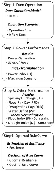 The resilience of a hydropower reservoir can be calculated at the dam water level, which is calculated from the inflow and outflow discharges and the current water storage. Since power generation is related to dam water level and outflow discharge, these are important considerations. If resilience is high, power generation can be increased, but there is a risk of water disaster. Therefore, to suggest the optimal operation rule using resilience, the methodology should be constructed by additionally considering spillway discharge, flood risk days, and drought risk days (Figure 4). Figure 4 shows the procedure for evaluating the power production performance of the hydropower reservoir.
