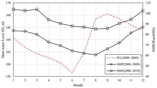 Comparison of monthly SMP price and water level at reservoir (2000~2019).