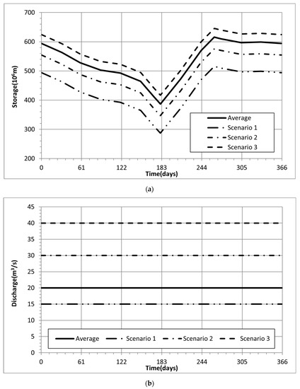 The operating standards for hydropower reservoirs in Korea were investigated and reviewed to establish an operation scenario. The power generation method of the hydropower reservoir is a regular power generation type, but the outflow discharge according to the water level is not determined. However, since various dams are built in a small area, it is necessary to establish an operation plan every month in accordance with the River Act and the operation standards for dams and weirs. In the process of establishing this plan, after predicting the monthly inflow based on historical data, the monthly target water level and discharge plan are set. The basic principle is to prevent drought and flood damage from occurring, and the discharge plan is finally decided by referring to the electricity supply and demand plan and the power generation stop plan. The establishment of this plan determines the outflow discharge by predicting the inflow and setting the target water level. The target water level is generally selected based on June and September, before and after the flood season, and this value is also calculated as the average value of historical data. Therefore, in this study, a scenario was established in which the target water level and target discharge were adjusted and operated based on the monthly average water level and outflow discharge of each dam. Figure 6 is a diagram showing how to set the target water level and target discharge in Hwacheon Dam, and all are set to be adjusted at a certain rate based on the average value. Actually, the current dam operation is performed with the values indicated by the solid lines in Figure 6a,b. As shown in the dotted lines in Figure 6a, the scenario was set to increase or decrease the target water level at a certain rate. In addition, the outflow discharge in Figure 6b was also increased and decreased at a certain rate based on the average value to operate. Scenarios that correspond to both the scenario of changing the target water level and the scenario of changing the target discharge were set up as scenarios. As a result, both the target water level and discharge were divided into 15 stages between the lowest and highest values to construct a scenario. The total number of scenarios is 225.