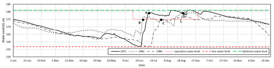 The concept of resilience was applied to the Hwacheon Dam using historical data. About 54% of the annual precipitation in Korea is concentrated during the flood season (June to September). Therefore, the hydropower reservoir in Korea was built for power generation, but since 1973, it has been contributing to flood control by setting a water level limit during the flood season. The limiting water level operation method causes losses in terms of power generation. To confirm this, resilience was applied using historical data before and after 1973. Resilience was compared in 1981 and 1986, when the average annual inflow was like that of 1971, before the operation of the limited water level during the flood season. In Table 2, hydropower data, operation data, and resilience of hydropower reservoirs by year were calculated and presented. Figure 7 compares dam water levels by year. In Figure 7, in 1971, when there was no limiting water level during the flood season, the water level in the dam recovered the fastest to normal high-water level (NWL) (Point A). In 1981 and 1986, the water level of the dam was operated below EL.175 m during the flood season due to the limited water level (Point B & C), and the hydropower reservoir was operated by restoring the water level to NWL at the end of the flood season (Point D). As a result of applying the resilience defined in this study using historical data for the period, it was found that the resilience of 1971, when it was operated without a limiting level, was greater. There is a clear difference in resilience during the flood period.