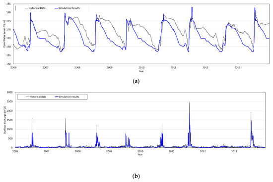 Comparison of historical data and simulation results. (a) Water level; (b) Outflow discharge.