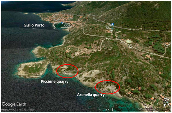The oldest quarry probably was opened at the time of Julius Caesar and was exploited at least until the early 19th century. It is the Cava del Foriano, also called “alle colonne” by the islanders, situated above the village of Giglio Porto, with traces of the extraction still visible. Other quarries can be seen near Punta Arenella (Piccione and Arenella quarries), Punta del Lazzaretto, Scalettino di Giglio Porto, Cala delle Cannelle (Gran Cava), and also at Cala delle Caldane (Bonsere). The quarries were cultivated intermittently until the middle of the last century (Figure 1).
