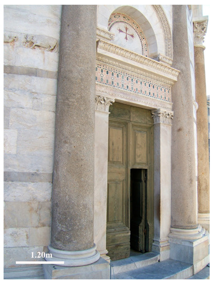 These quarries were famous above all for the export of beautiful columns, big monoliths weighing several tons, dug directly into the sea front of the quarries, which were then transported by rollers and pontoons on ships. Examples are the six granite columns in the Roman Villa of Domizi Enobarbi in Giannutri island, in the Neronian Port of Anzio, in Rome in the porch of S. Lorenzo in Lucina (first two columns from the right), in the Romanesque porch of via Santi Quattro Coronati, in the pronaos of Santa Croce di Gerusalemme, in the Cancelleria Palace (two columns in the upper and lower colonnade, respectively), in Santa Maria Maggiore (two columns in the left side of the porch), in Sant’Anastasia (four columns, the first and last of the central nave), in Pieve di Santa Maria Assunta di San Leo, in the Forum of Caesar, in Naples in the Church of Gerolomini (12 columns) [12], and in the façade of the Royal Palace (eight columns) from shafts lying in the Foriano quarry. Columns of Giglio origin, probably from the bare of Roman monuments, are present in the Pisa Bell tower (Figure 2), in San Piero a Grado Basilica near Pisa, in the Florence Baptistery, and in the Cathedral of Gaeta. Other columns of later extraction are in the central nave of Pisa Cathedral (four columns in substitution of those damaged by the fire of 1595), in Piazza del Campo in Siena, and in the façades of Marignoli and Bennicelli palaces in Rome.