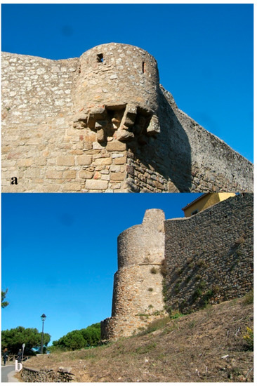 On Giglio Island, the granite, used as building material in exposed ashlars, characterises all the civil constructions of the picturesque village of Giglio Castello, which the Medici, in the 16th century, took care to protect from the raids of the pirates by building a mighty circle of walls (Figure 3a). Currently 7 of the 10 original towers and the suggestive three-door entrance remain (Figure 3b).