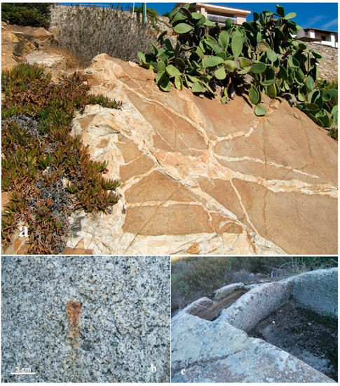 Observing the whole complex, a brown colour is evident, which is due to the intense chromatic alteration of the rock and constitutes one of the first phases of the decay, which is macroscopically manifested by intercrystalline decohesion, a phenomenon common to all granite rocks (Figure 4a,b).