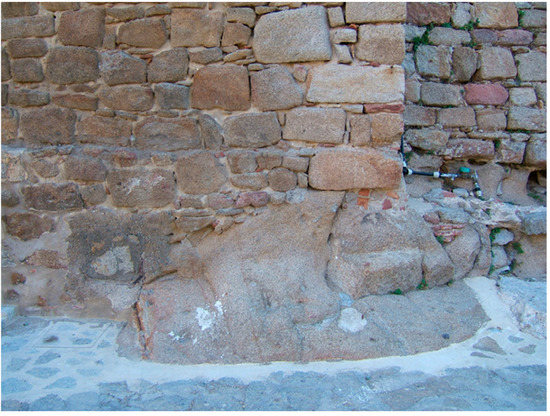 Figure 5. Detail of a granite ashlar masonry in which the intense chromatic alteration is evident (the rock changes from an overall grey colour to a "rust" colour) and the strong intergranular disintegration.