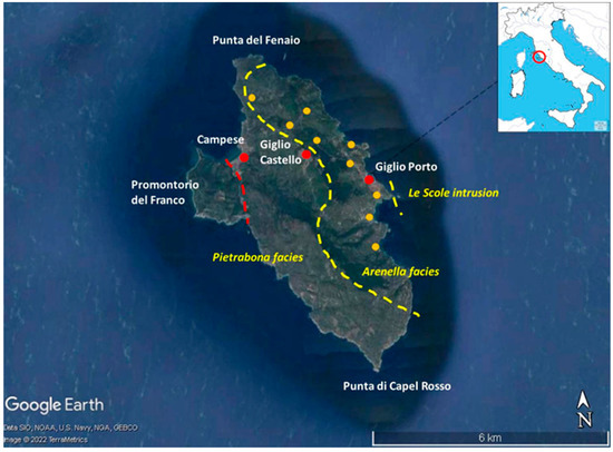 Giglio Island belongs to the Tuscan Archipelago and is located in the stretch of sea facing the Argentario promontory. The 90% of its extension is made of a monzogranite intrusion that rises to the surface and is linked to the extensive tectonic phase following the collision between the Adria and Corsica–Sardinia plates that formed the Apennine chain. In this tectonic domain, a series of intrusive, volcanic, and/or sub-volcanic magmatism episodes, known in literature as the Tuscan Magmatic Province, took place [14,15].