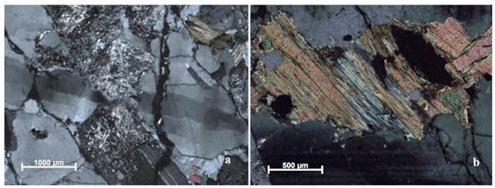 Figure 7. Image in petrographic thin section (crossed polarisers): in the centre of the image there is a plagioclase affected by sericitisation phenomena (sericite with higher interference colours (yellowish) (a); image in petrographic thin section (crossed polarisers). In the centre of the image, there is a biotite with partial transformation in chlorite (b).