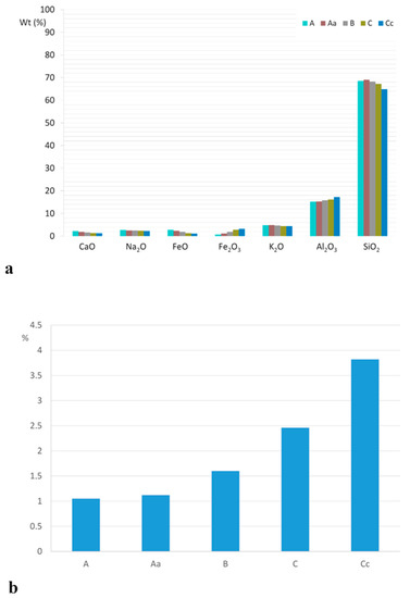 These indexes are in agreement with what is observed in Figure 8 regarding the alteration trend, i.e., leaching of mobile cations (K, Na, Ca) with their consequent decrease and relative increase in immobile phases (Al, Fe, Si) from samples A up to Cc.