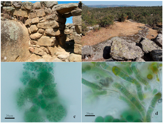 Figure 9. Biocolonisers of granite: (a) Parmelia conspersa (green greyish) and black patina; (b) Lecanora sulfurea (green yellowish), Tephormela atra (grey), and Parmelia loxodes (dark brown on the horizontal surface); (c) Chroococcidiopsis sp.-like colonies; (d) Calothrix sp.-like filaments.