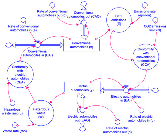 The rules of causality are simple: (1) conventional automobiles generate emissions of CO [22,23,57], (2) electric automobiles produce hazardous waste [36,58], (3) emissions and hazardous waste generate nonconformity in vehicle consumers taking the option to change technology to reduce its environmental impact [32], (4) the enthusiasm to acquire one or another technology leads to the entry of automobiles into the system. The hazardous waste of conventional vehicles is out of the scope of this research work, since it is not as important a selection criterion for buyers as the hazardous waste of electric automobiles.