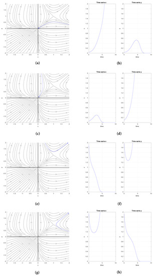 By solving Equation (8), it is found that Equation (4) has the equilibrium and , each of which has a stability that depends on the values of the and parameters. For the equilibrium , the eigenvalues are and ; while for the equilibrium , the eigenvalues are . This leads to four cases called transition families; each one is presented in Figure 2 and Figure 3.