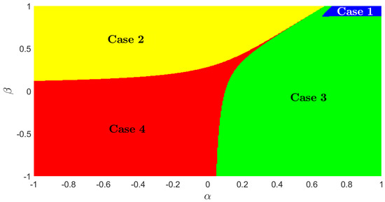 Since the equilibrium points’ stability of the dynamical system in Equation (4) depends on the bifurcation parameters and , it is possible to obtain a two-dimensional bifurcation diagram, as depicted in Figure 4. This diagram summarizes the behaviors displayed by the system for the different values of the two bifurcation parameters. Notably, the parameter array with the lowest probability of occurrence is for the first family of transitions (in the figure, this family appears as case 1 for graphical simplicity). The parameter arrays to obtain transition families 2, 3, and 4 have been denoted as case 2, case 3, and case 4, respectively. The probability areas of these last cases are broader than case 1; so, in theory, their occurrence chances must be greater than case 1.