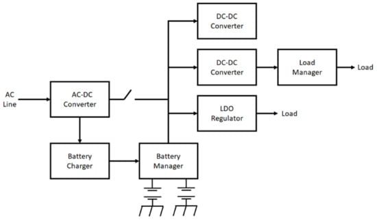 Portable devices normally have a combination of subsystems that require different voltage levels. As shown in Figure 9 [], modern portable devices such as mobile phones, tablets, and portable electronic medical devices consist of many subsystems: batteries, memory, display, peripherals, etc. []. Those components operate at various voltage levels based on their requirements. When designing powering techniques for these subsystems, it is very important to verify that it produces the desired voltage level regardless of the following: