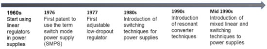 As shown in Figure 2, in the 1960s and early 1970s, power supplies were linear regulator designs having efficiencies in the range of 30–50% []. With the introduction of switching techniques in the 1980s, efficiency rose to 60–80%. In the mid-1980s, power densities were about 50 W/in3 []. With the introduction of resonant converter techniques in the 1990s, this increased to 100 W/in3. When high-speed and power-hungry processors were introduced during the mid-1990s, much attention was focused on transient response, and industry trends were to mix linear and switching systems to obtain the best of both technologies []. Low-dropout (LDO) regulators were introduced in 1977 to power noise-sensitive and fast transient loads in many portable applications []. In the late 1990s, power management and digital control concepts and many advanced approaches were introduced into power supply and overall power management solutions []. In addition to the two main technologies, SCCs (also known as charge pumps) are used. Charge pumps are lightweight, small converters that offer some attractive features such as ease of use, low cost, compactness, inductor-less architecture, and ruggedness. The voltage gain of a charge pump is fixed, and it depends on the number of switching capacitors and switches. Therefore, the desired output voltage is achieved by manipulating the capacitor connections. The output voltage can be either regulated or unregulated based on the architecture [,]. Charge pumps can drive output currents typically up to 250 mA due to their considerable output impedance. Table 1 provides a characteristic comparison of the performance of SMPS, charge pumps, and linear regulators.