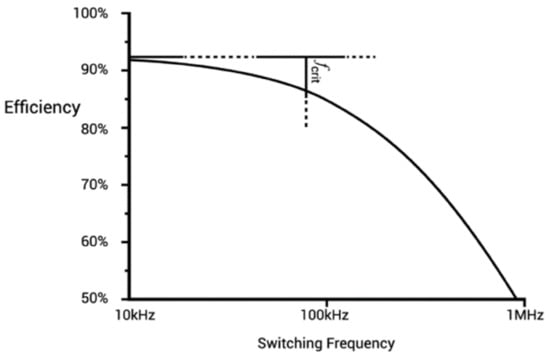 SMPS converts energy using high-frequency switching. BJTs, MOSFETs, and diodes are the commonly used switching devices. Even though switching delays are simply neglected in the theoretical efficiency calculations in SMPS, in reality, there is a small delay while changing the operation state of the switching component where neither current nor voltage is zero across the switching device. As a result, power loss occurs during the transient time where the operation status of the switch changes from on-state to off-state or vice versa []. Switching loss is proportional to the switching frequency, as reflected in the efficiency curve in Figure 3. Furthermore, MOSFETS and BJTs contain internal capacitances and inductances. As a result, there are energy losses due to the charging and discharging of these internal capacitances and inductances and from their parasitic resistances. These losses are also proportional to the switching frequency.
