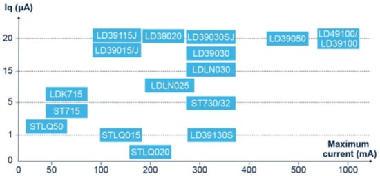 - Low Quiescent Current (IQ) LDO Regulators—STMicroelectronics. Available online: https://www.st.com/en/power-management/low-iq-ldo-regulators.html (accessed on 6 February 2022).