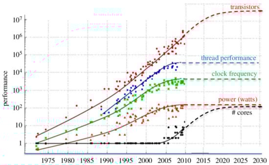 - Shalf, J. The Future of Computing beyond Moore’s Law. Philos. Trans. R. Soc. A Math. Phys. Eng. Sci. 2020, 378, 20190061. [Google Scholar] [CrossRef] [PubMed] [Green Version]