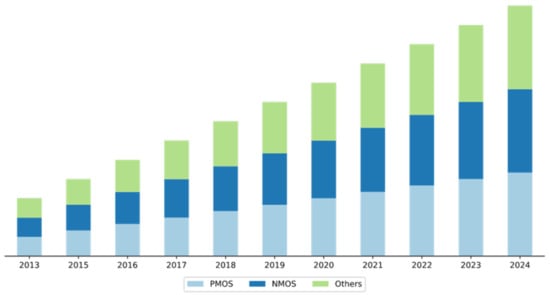With the growing market for LDOs, researchers are focused on further expanding the horizons of currently available LDOs. With the high level of LDO applications in portable devices, major LDO manufacturers and researchers are keen to further enhance the performance of LDOs []. The efficiency of LDOs, size of LDOs, and the noise and EMI levels of LDOs are the major key areas of high concern for enhanced performance of portable devices.